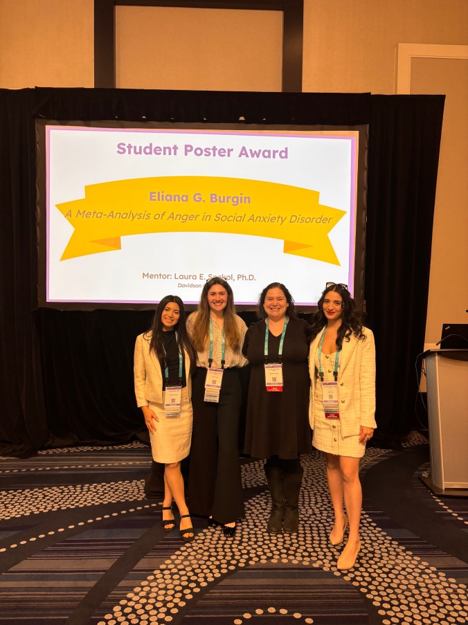 Eliana also won the student poster award and presented a talk at the CPLAC business meeting. It was titled A Meta-Analysis of Anger in Social Anxiety Disorder. See Eliana below (second from left, with Dr. Sockol and two other Davidson students, Shea Heckman and Reina Sevintune).